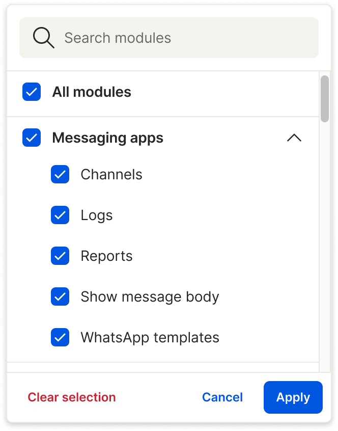 - Select the specific modules and sub-permissions this role should have. You can grant access to entire product areas or select granular permissions like 'View Logs' or 'View Reports'.