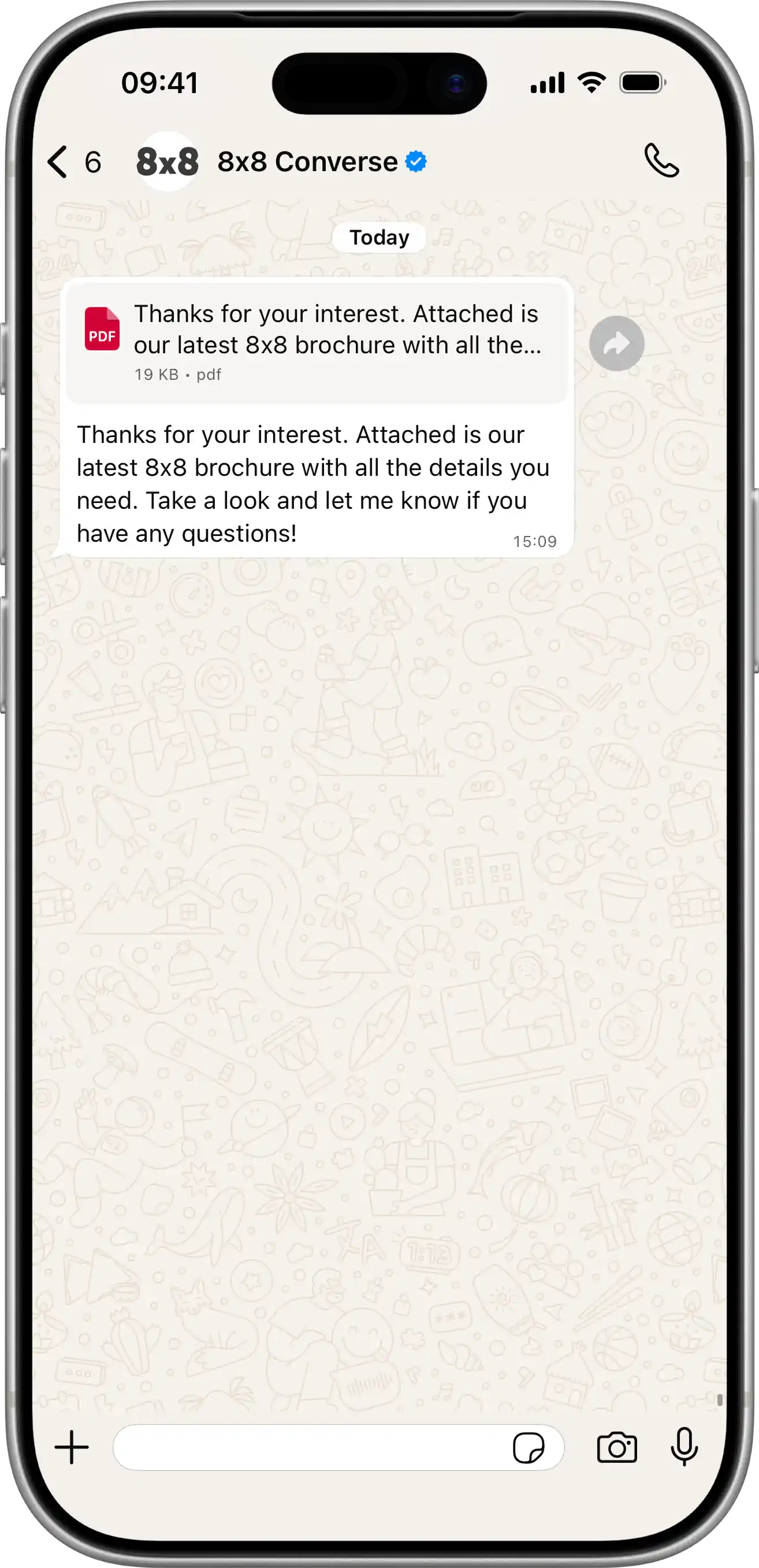 Document Message | Send Message: POST /api/v1/subaccounts/{subAccountId}/messages Sends a document from a URL with optional filename and caption. View JSON{ "user": { "msisdn": "{{PhoneNumber}}" }, "type": "File", "content": { "url": "https://pdfobject.com/pdf/sample.pdf", "text": "Thanks for your interest. Attached is our latest 8x8 brochure with all the details you need. Take a look and let me know if you have any questions!" } }