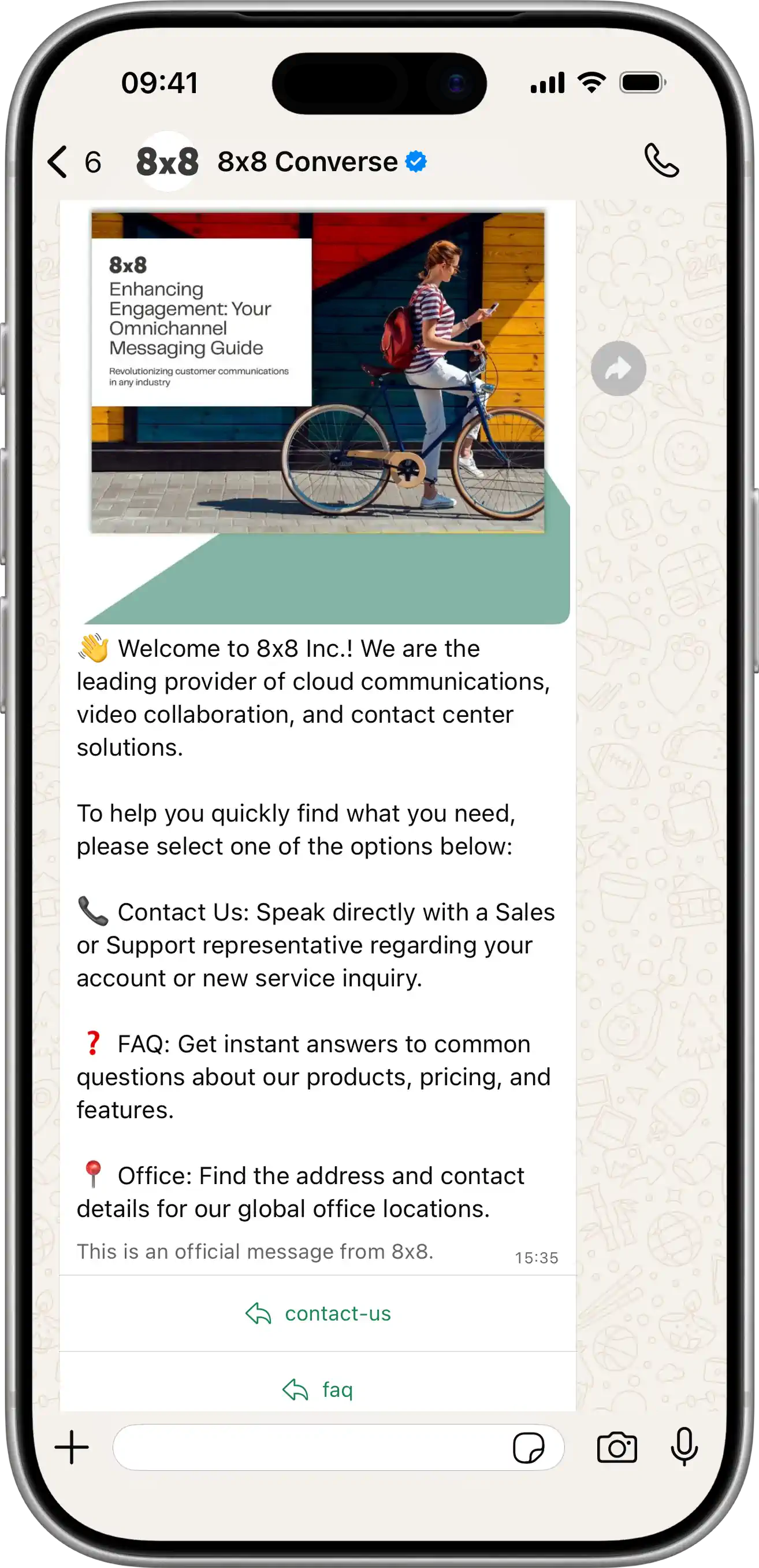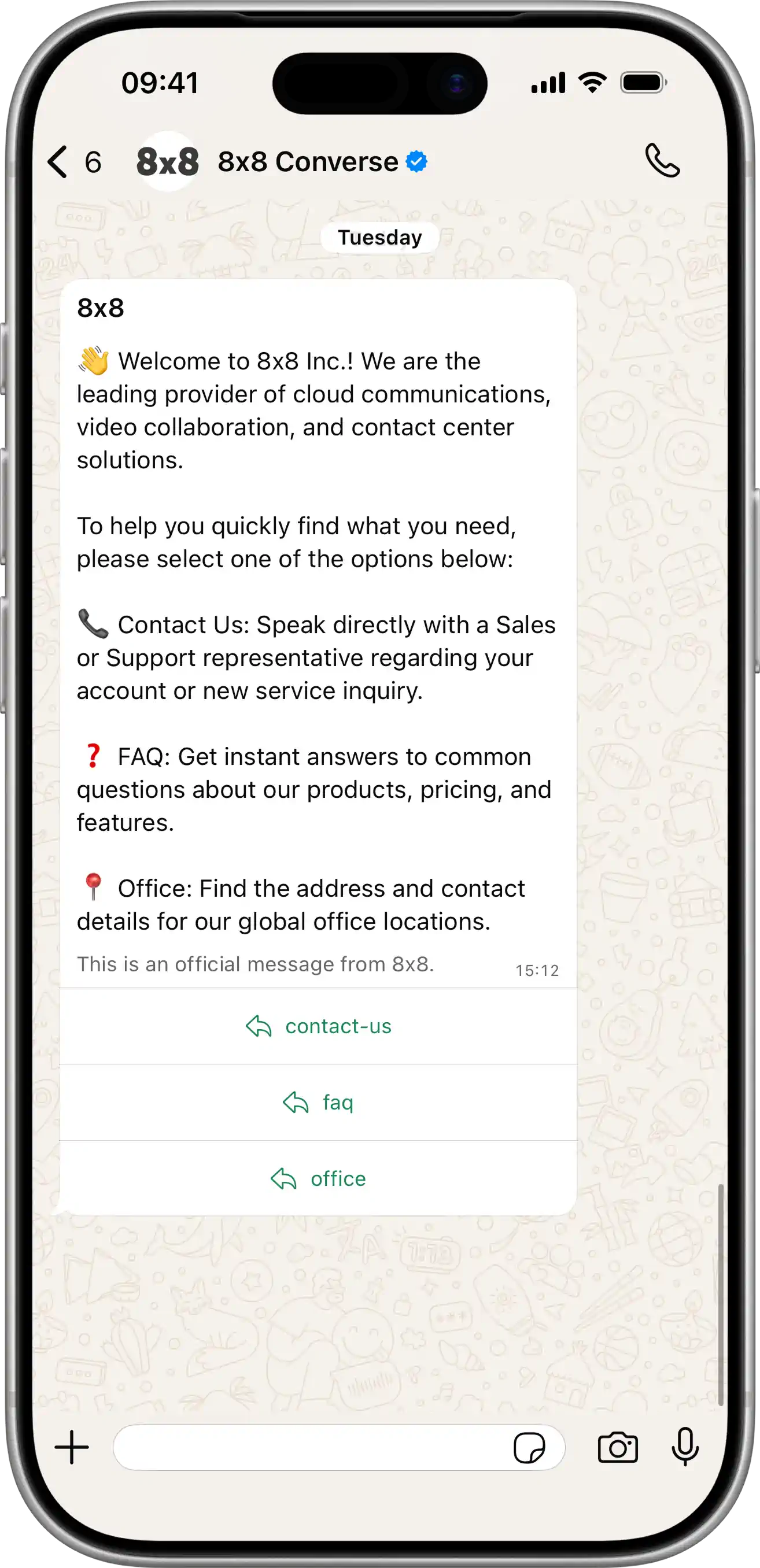 | Send Message: POST /api/v1/subaccounts/{subAccountId}/messages Creates an interactive message with up to 3 reply buttons. Users can tap a button to send a quick reply. View JSON{ "user": { "msisdn": "{{PhoneNumber}}" }, "type": "interactive", "content": { "interactive": { "type": "button", "header": { "type": "text", "text": "8x8" }, "body": { "text": "👋 Welcome to 8x8 Inc.! We are the leading provider of cloud communications, video collaboration, and contact center solutions.\n\nTo help you quickly find what you need, please select one of the options below:\n\n📞 Contact Us: Speak directly with a Sales or Support representative regarding your account or new service inquiry.\n\n❓ FAQ: Get instant answers to common questions about our products, pricing, and features.\n\n📍 Office: Find the address and contact details for our global office locations." }, "footer": { "text": "This is an official message from 8x8." }, "action": { "buttons": [ { "type": "reply", "reply": { "title": "contact-us", "id": "option-1" } }, { "type": "reply", "reply": { "title": "faq", "id": "option-2" } }, { "type": "reply", "reply": { "title": "office", "id": "option-3" } } ] } } } }