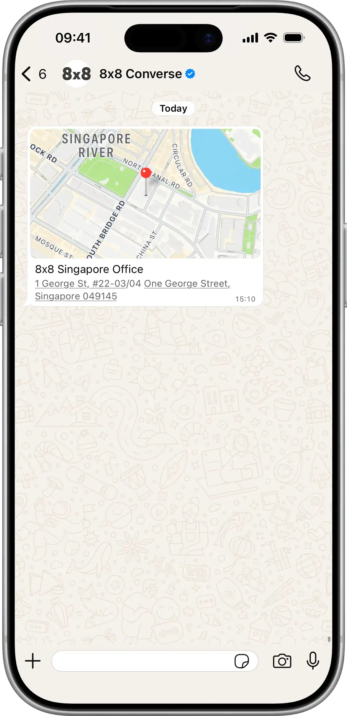 Location Message | Send Message: POST /api/v1/subaccounts/{subAccountId}/messages Sends a location message with latitude, longitude, name, and address. View JSON{ "user": { "msisdn": "{{PhoneNumber}}" }, "type": "location", "content": { "location": { "latitude": "1.2857", "longitude": "103.8479", "name": "8x8 Singapore Office", "address": "1 George St, #22-03/04 One George Street, Singapore 049145" } } }