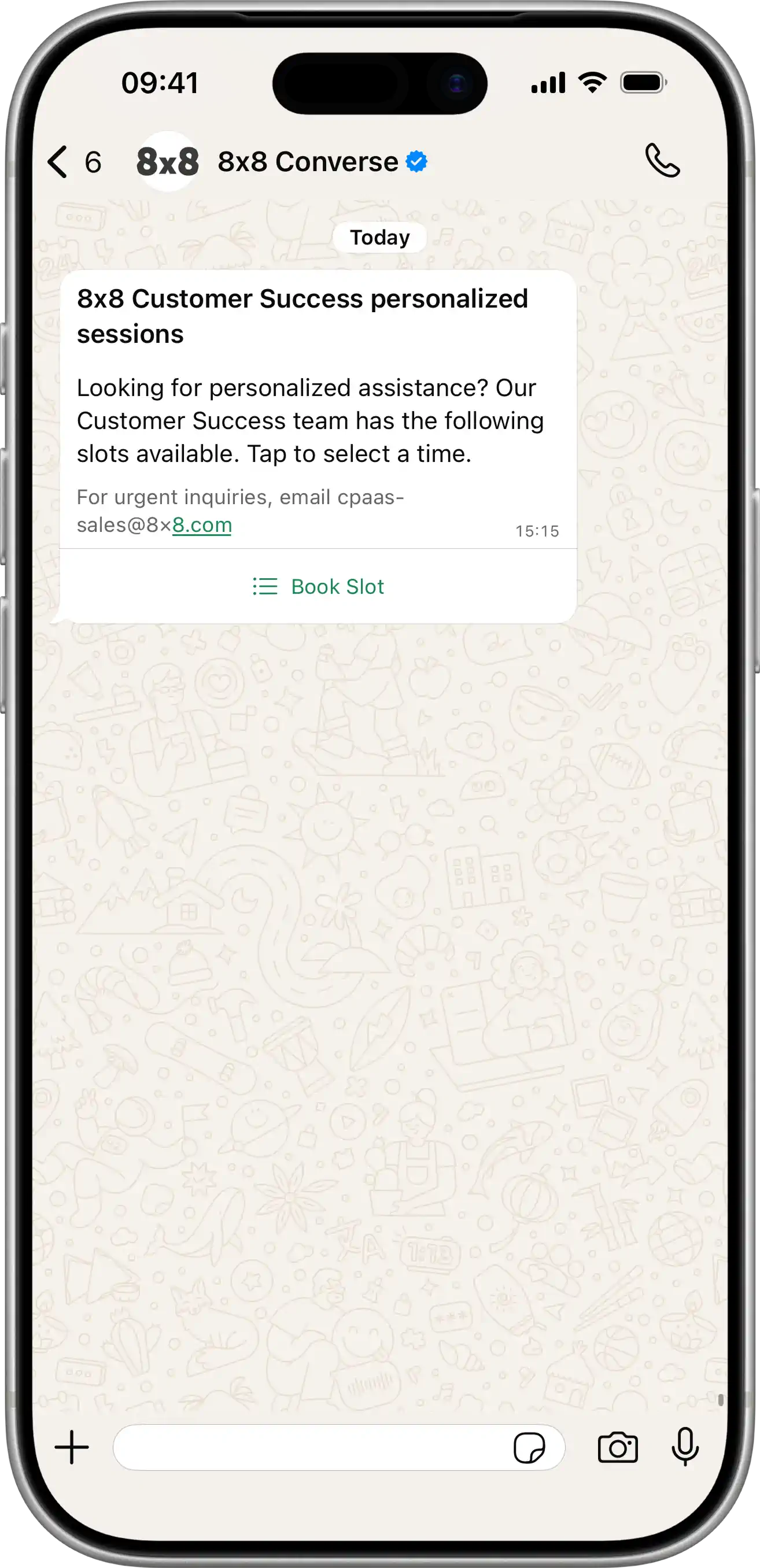 | Send Message: POST /api/v1/subaccounts/{subAccountId}/messages Creates a list menu with multiple options organized in sections. View JSON{ "user": { "msisdn": "{{PhoneNumber}}" }, "type": "interactive", "content": { "interactive": { "type": "list", "header": { "type": "text", "text": "8x8 Customer Success personalized sessions" }, "body": { "text": "Looking for personalized assistance? Our Customer Success team has the following slots available. Tap to select a time." }, "footer": { "text": "For urgent inquiries, email cpaas-sales@8×8.com" }, "action": { "button": "Book Slot", "sections": [ { "title": "Oct 9, 2024", "rows": [ { "id": "slot-1", "title": "Monday, Oct 9", "description": "9:00 AM - 10:00 AM" }, { "id": "slot-2", "title": "Monday, Oct 9", "description": "11:00 AM - 12:00 PM" } ] }, { "title": "Oct 10, 2024", "rows": [ { "id": "slot-3", "title": "Tuesday, Oct 10", "description": "2:00 PM - 3:00 PM" }, { "id": "slot-4", "title": "Tuesday, Oct 10", "description": "4:00 PM - 5:00 PM" } ] } ] } } } }