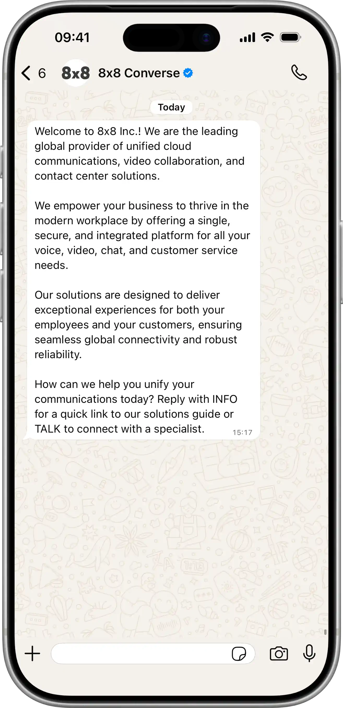 Text Message | Send Message: POST /api/v1/subaccounts/{subAccountId}/messages Sends a plain text message to the user. View JSON{ "user": { "msisdn": "{{PhoneNumber}}" }, "type": "text", "content": { "text": "Welcome to 8x8 Inc.! We are the leading global provider of unified cloud communications, video collaboration, and contact center solutions.\n\nWe empower your business to thrive in the modern workplace by offering a single, secure, and integrated platform for all your voice, video, chat, and customer service needs.\n\nOur solutions are designed to deliver exceptional experiences for both your employees and your customers, ensuring seamless global connectivity and robust reliability.\n\nHow can we help you unify your communications today? Reply with INFO for a quick link to our solutions guide or TALK to connect with a specialist." } }