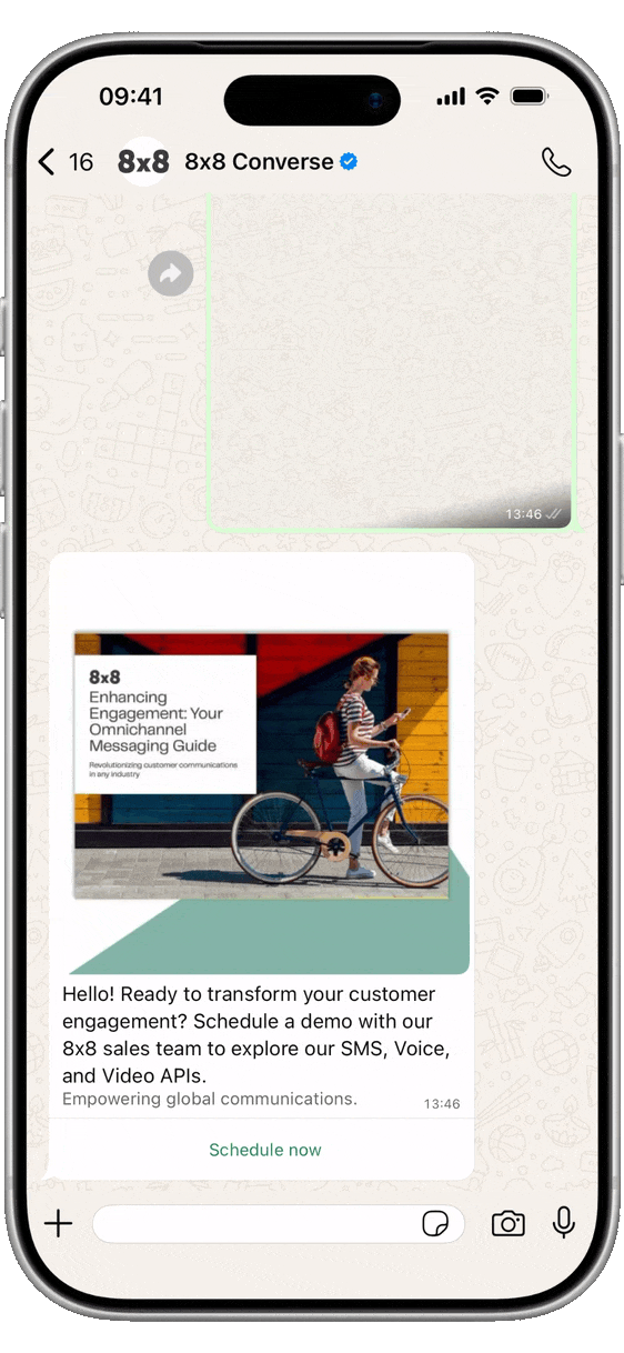 Send Template: POST https://chatapps.8x8.com/api/v1/subaccounts/{subAccountId}/messages Sends the template, providing the url for the video and the text for the body parameter. View JSON{ "user": { "msisdn": "+15551234567" }, "type": "template", "content": { "template": { "language": "en_US", "name": "video_template_demo", "components": [ { "type": "header", "parameters": [ { "type": "video", "url": "https://samplelib.com/lib/preview/mp4/sample-5s.mp4" } ] }, { "type": "body", "parameters": [ { "type": "text", "text": "Alex" } ] }, { "type": "button", "index": "0", "subType": "url", "parameters": [ { "type": "text", "text": "omnichannel-messaging" } ] } ] } } }