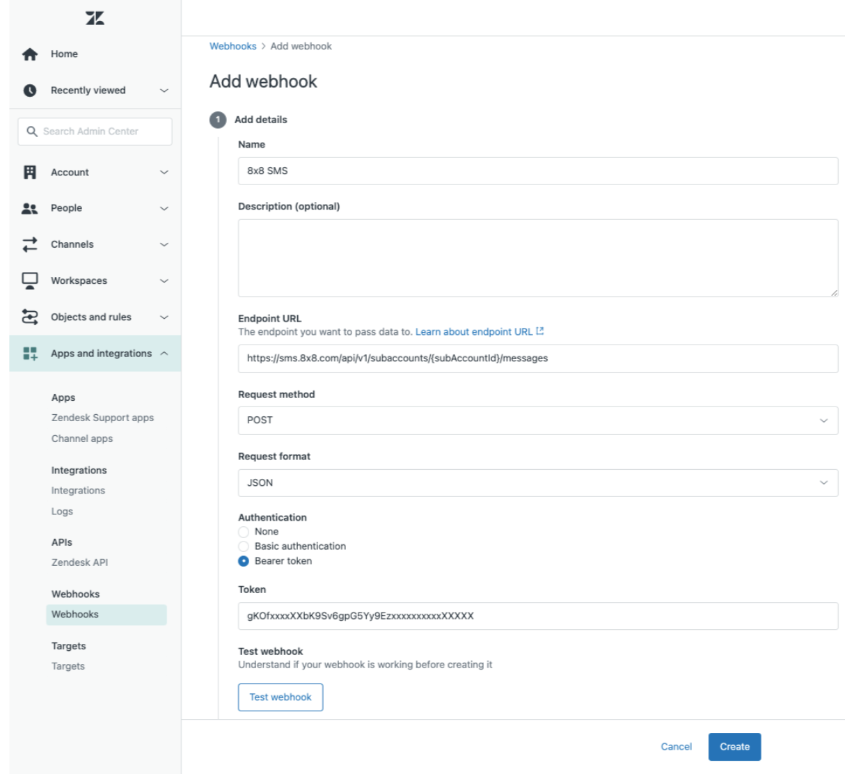 - Authentication: choose Bearer token and paste your 8x8 API key (Zendesk will send
